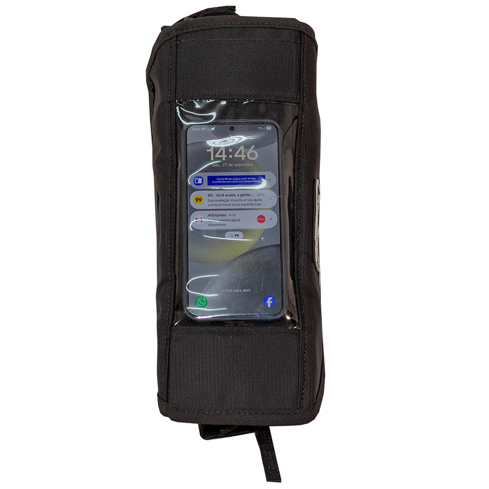– A tampa possui compartimento com visor transparente para o celular, permitindo fácil visualização e uso de aplicativos de navegação durante o trajeto.